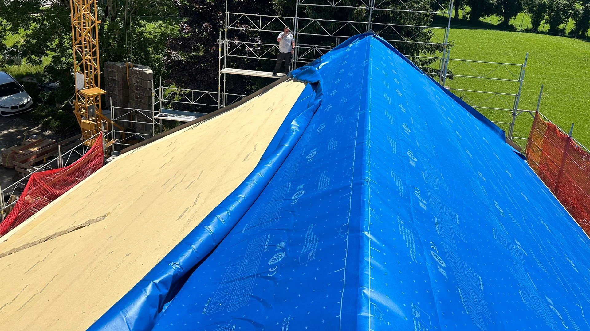 Zum Schutz der Konstruktion während der Bauphase können SOLITEX WELDANO 3000 Unterdeckbahnen bis zu 6 Monate frei bewittert werden (z. B. Behelfsdeckung laut ZVDH).